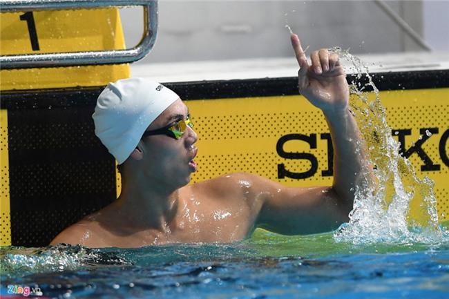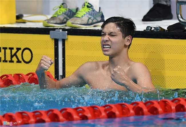 Pha ăn mừng cực kỳ phấn khích khi về đích của Kim Sơn, động tác đặt tay lên ngực trái đầy tự tin như khẳng định về một thần đồng mới của bơi lội nam Việt Nam. Sơn còn giành thêm 1 tấm HCĐ nội dung 400 m tự do, phá kỷ lục quốc gia với thành tích 3'54"21. |
