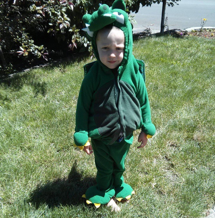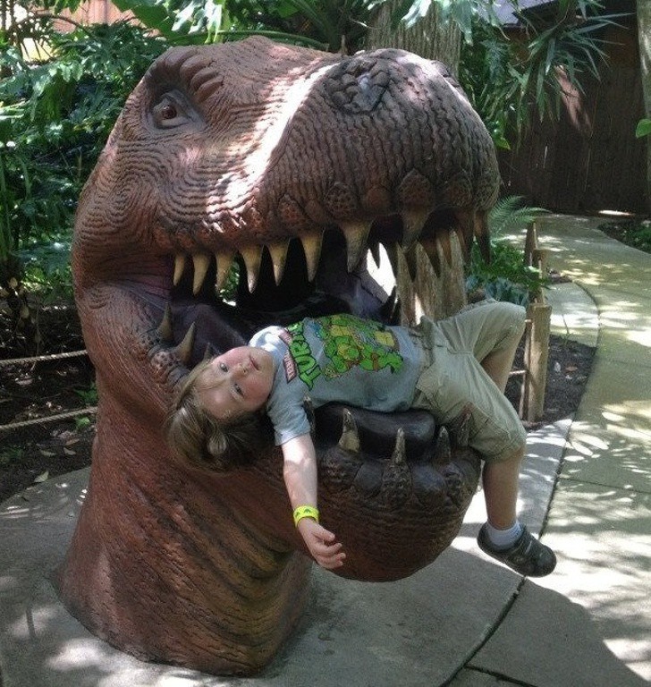 Mẹ vừa rời mắt có 5 giây thôi mà đã thấy "ông" con nằm gọn trong miệng khủng long bạo chúa thế này rồi. Nhưng cũng không thể phủ nhận khả năng phối hợp khung cảnh của con khá tốt đấy.