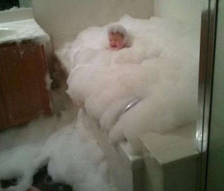 Con khăng khăng đòi đổ hết chai sữa tắm vào bồn, bây giờ tự chịu hậu quả thôi, mẹ cũng chẳng biết làm sao nữa.