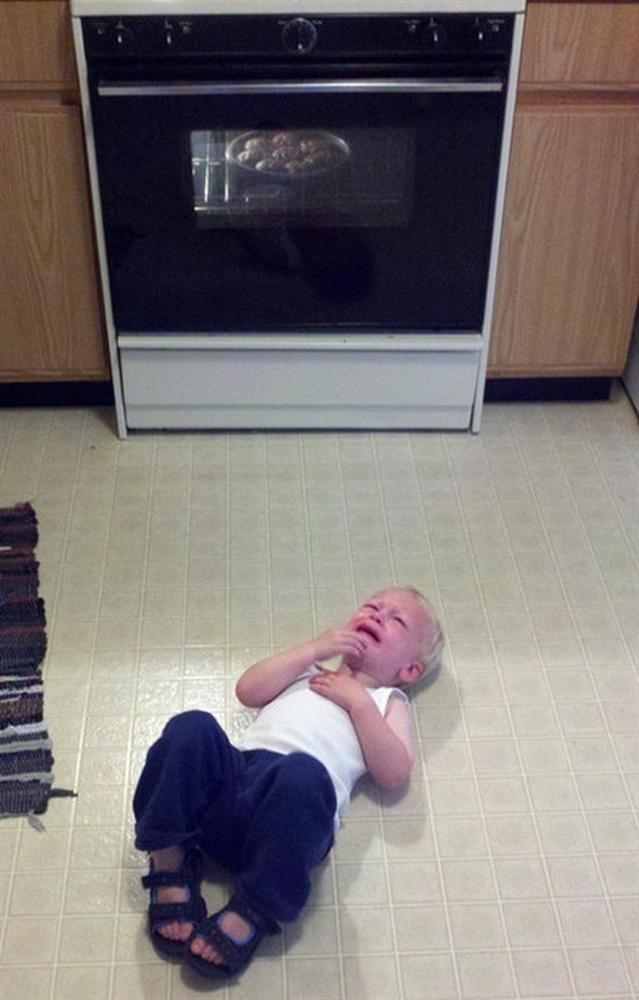 Cậu bé nằm lăn ra sàn nhà ăn vạ bất chấp mẹ hết lời giải thích, đơn giản vì những chiếc bánh quế chưa kịp chín để cho cậu chàng oánh chén đây mà.