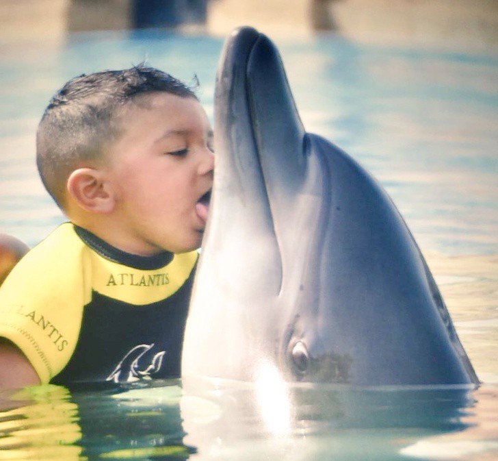 Không biết là thơm hay liếm nữa, nhưng nhìn vẻ mặt và đôi mắt mở to của chú cá heo kia thì chắc cũng đang rất thích nụ hôn này.