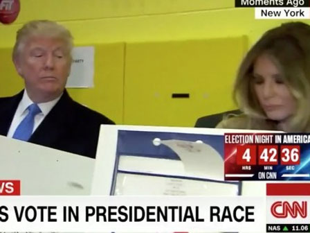 Một trong những khoảnh khắc thú vị trong ngày bầu cử, là khi ông Trump ‘liếc’ nhìn lá phiếu của vợ mình là Melania. Ảnh: CNN |