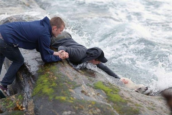 2 thanh niên Na-uy bất chấp nguy hiểm để cứu mạng một chú cừu con rơi xuống biển.
