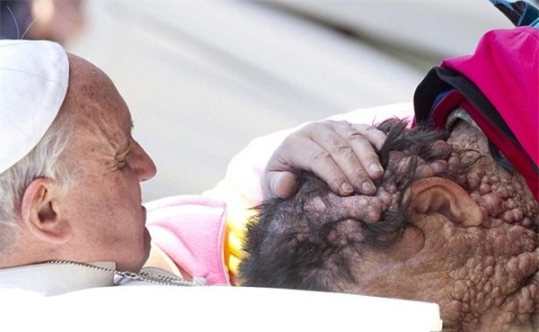 Giáo hoàng Francis ban phước và ôm hôn "người đàn ông mặt quỷ" Vinicio Riva tại quảng trường thánh Peter, Roma, Ý.