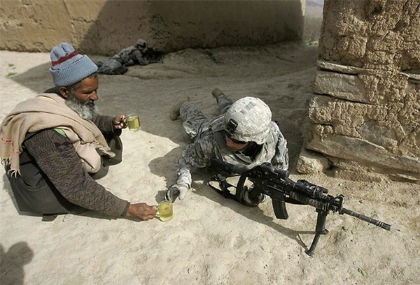 Một người dân Afghanistan mời binh sĩ Mỹ uống trà trong ca trực.