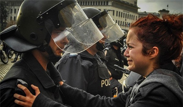 Sĩ quan cảnh sát và cô gái biểu tình cùng bật khóc tại thành phố Sofia, Bulgari.