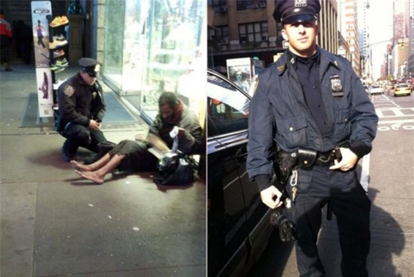 Sĩ quan cảnh sát mua giày tặng người đàn ông vô gia cư ở quảng trường Time, New York, Mỹ.