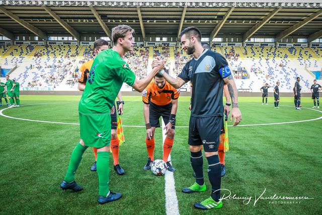Hai đội trưởng bắt tay trước trận đấu. Đội trưởng của Sint-Truidense hiện tại là số 7 Jordan Botaka, cầu thủ người DR Congo