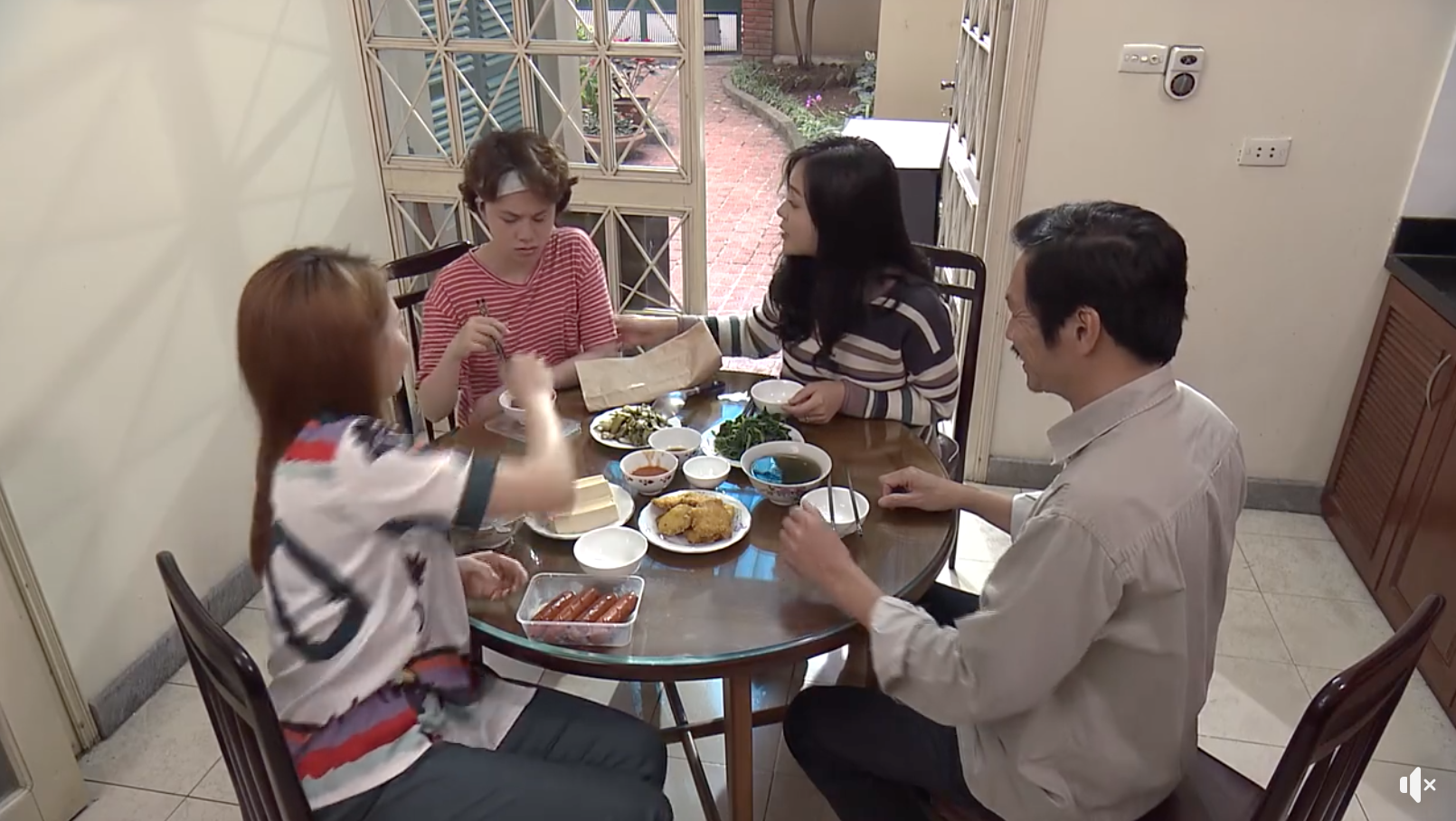 Thư vốn là cô gái mồm mép lanh lẹ nên chắc chắn không thể thiếu những lời nịnh nọt bố mẹ chồng. Tuy nhiên phân cảnh này cũng thể hiện rõ rằng Thư vẫn là cô con gái biết kính trên, nhường dưới. Dù được bố mẹ chồng đồng ý cho nghỉ ngơi nhưng Thư vẫn cố kéo Vũ ra khỏi giường, cùng xuống nhà ăn bữa cơm đầu tiên với bố mẹ cho bằng được.