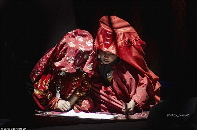 Những bé gái Kyrgyz trong những chiếc áo choàng màu sặc sỡ "tạo dáng"trước ống kính camera của nhiếp ảnh gia người Pháp.