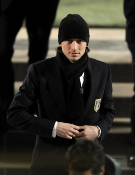Tiền vệ Montolivo giấu mái tóc lãng tử của mình bằng chiếc mũ len đen.