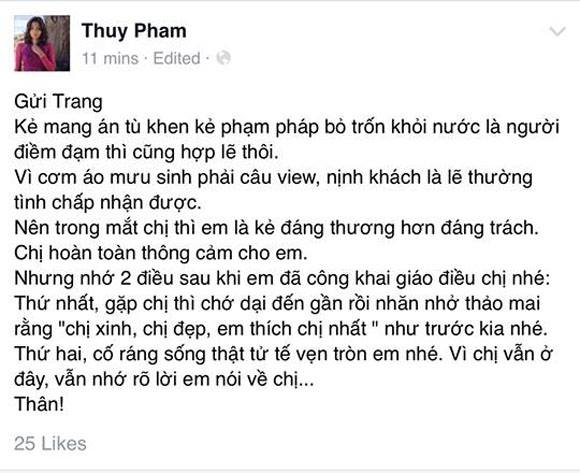 Trang Trần cũng không vừa khi liền sau đó tung status đáp thẳng mặt đàn chị, thậm chí cô viết những dòng xoáy sâu hơn vào nỗi đau của đàn chị.