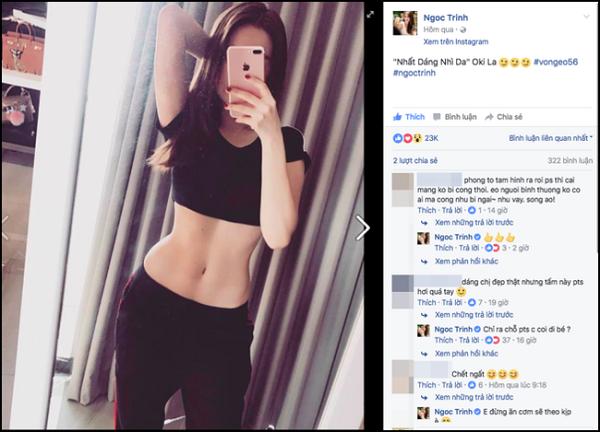 Còn nhớ hồi tháng 4/2017, Ngọc Trinh đăng bức hình khoe lấy lại được vòng eo mơ ước sau thời gian lên cân. Trước ý kiến của một cư dân mạng cho rằng bức ảnh photoshop quá tay, Ngọc Trinh thẳng thắn yêu cầu người này chỉ ra chỗ nghi ngờ có chỉnh sửa.