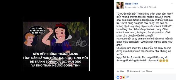 Chuẩn bị làm show thì lo tìm mẫu mà copy đi chứ đừng dựa hơi phụ nữ để câu view như những lần trước. Ngọc Trinh - Lê Hà - Hậu Phương - Hải Dương và thượng đế không thích điều này anh nhé!".