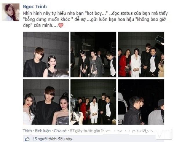 Đáp trả Ngọc Hân, Ngọc Trinh tung loạt ảnh trong sự kiện cùng Kim Woo Bin cùng dòng chú thích: "Gửi hình này tự hiểu nha bạn hot boy... đọc status của bạn mà “bỗng dưng muốn khóc” dễ sợ. Gửi luôn bạn Hoa hậu không bao giờ đẹp của mình”.