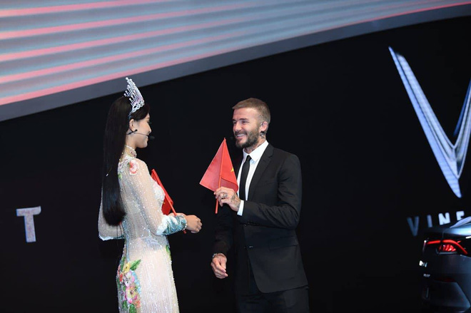 Tại sự kiện, tân Hoa hậu dành tặng Beckham lá cờ Việt Nam đại diện cho niềm tự hào dân tộc.