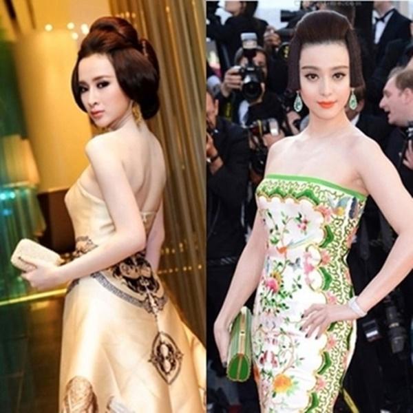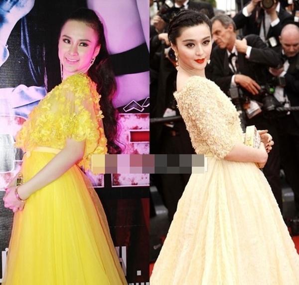 Mặc dù nhiều lần bị công chúng mang ra so sánh với nữ diễn viên Phạm Băng Băng vì những điểm tương đồng "khó hiểu" nhưng "bà mẹ nhí" vẫn tiếp tục diện trang phục nhái trong 1 khoảng thời gian dài.