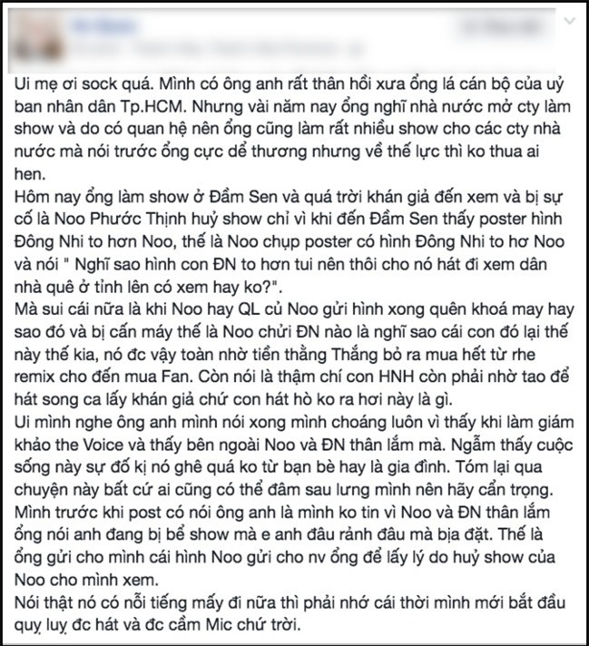 Dòng trạng thái từ một tài khoản mạng xã hội tố Noo Phước Thịnh đột ngột hủy show vì hình ảnh trên poster nhỏ hơn Đông Nhi.