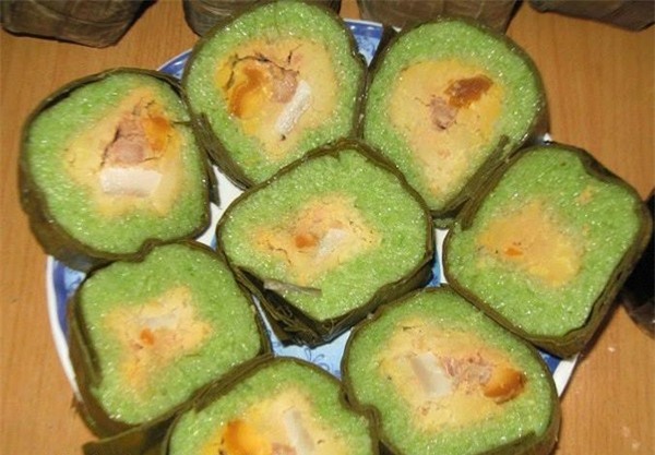 đỗ, từng miếng thịt. Gạo nếp cái hoa vàng dẻo thơm, kết hợp với đỗ xanh