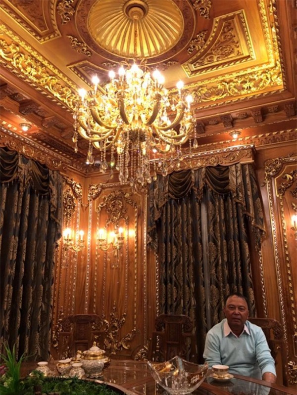 Tòa lâu đài chiếm lĩnh 4 mặt tiền, xây dựng trên khuôn viên 2.700m2, diện tích sàn 300x5 tầng. Chi phí xây dựng thô tòa lâu đài tiêu tốn của gia chủ khoảng 20 tỷ đồng. Phần gỗ trang trí là loại gỗ đỏ quý hiếm tiêu tốn khoảng 50 tỷ đồng, trong đó có cây gỗ nguyên khối lên đến 1 triệu USD. Chi phí xây dựng khoảng 100 tỷ đồng.