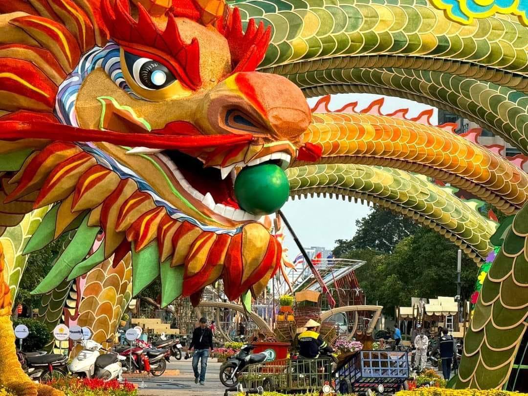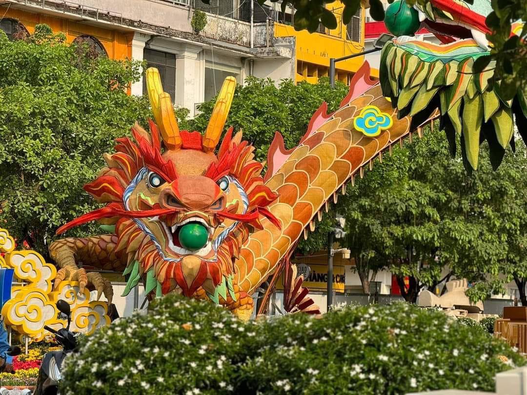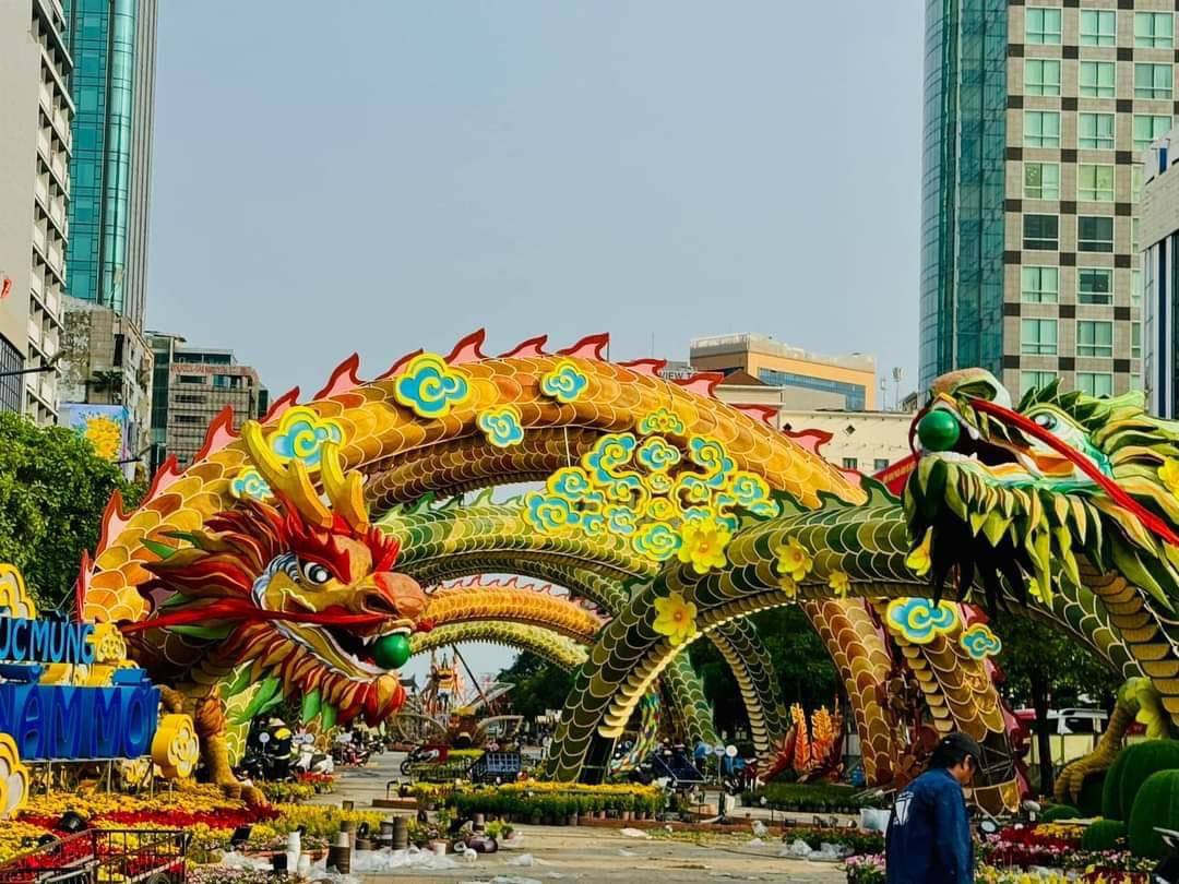 Ra mắt muộn nhưng lại nhận về vô số lời khen phải kể đến con rồng ở đường hoa Nguyễn Huệ (TP.HCM). Rồng ngậm châu với đuôi dài, uốn lượn, tạo hình chiếc cổng hình vòng cung, nổi bật giữa muôn ngàn màu vàng của cúc mâm xôi, là điểm nhấn của đường hoa nổi tiếng. Các chú rồng ở đây cũng được đánh giá "có hồn", hợp mắt công chúng.