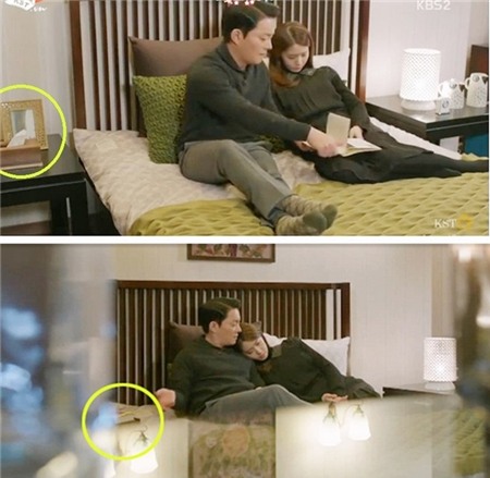 quay trên giường giữa Da Jung và Kwon Yool, chiếc gương, hộp khăn giấy