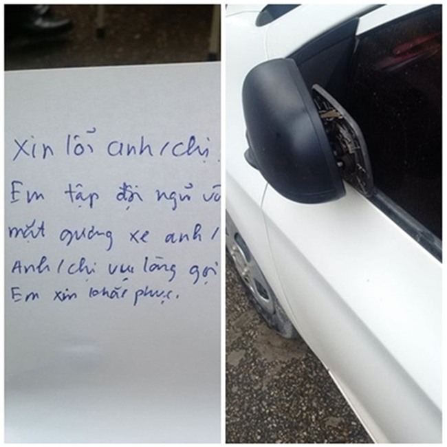 "Anh hay chị, cô hay bác, ông hay bà, cháu đi đón con đường đông, phanh không kịp, có va vào gương xe bị vỡ rồi ạ. Có gì cho cháu xin lỗi hoặc cần đền thì liên hệ... Xin chân thành xin lỗi!", trích lời nhắn xin lỗi của phụ nữ trên.
