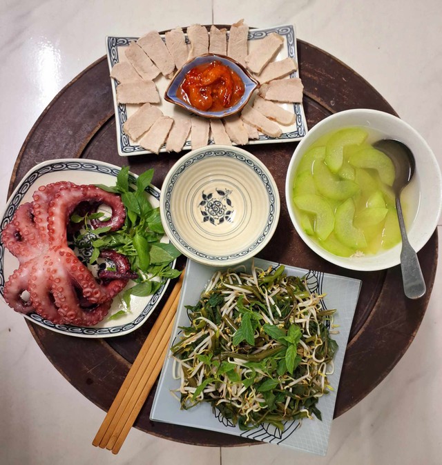 Điều thú vị là, từ mâm cơm 50k với thịt lợn luộc ở trên, chỉ cần thêm một chú bạch tuộc hấp tươi rói tầm trên 2 lạng giá 80k, bữa cơm giản dị đã được chị Hoa Dành Dành nâng cấp lên hẳn.