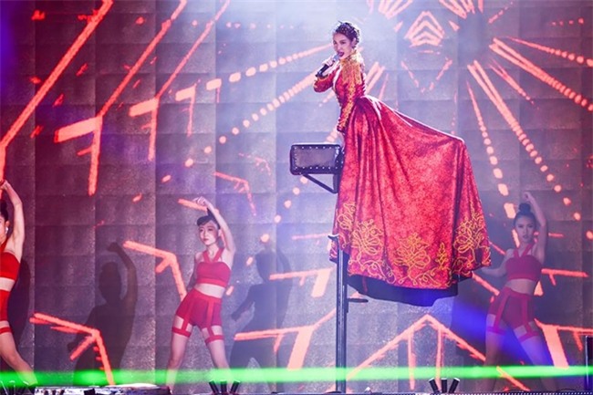 Tại đêm nhạc H-Artistry 2016, Hoàng Thùy Linh giấu vẻ sexy trong bộ đồ tứ thân.