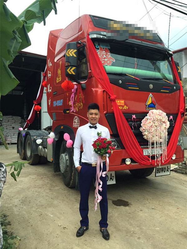 Tuy nhiên, đến ngày đón dâu, hình ảnh hai chiếc đầu kéo xe khổng lồ, trang trí hoa, bóng bay thêm phần ngộ nghĩnh lừng lững xuất hiện trước cửa nhà gái khiến gia đình cô dâu một phen sửng sốt.