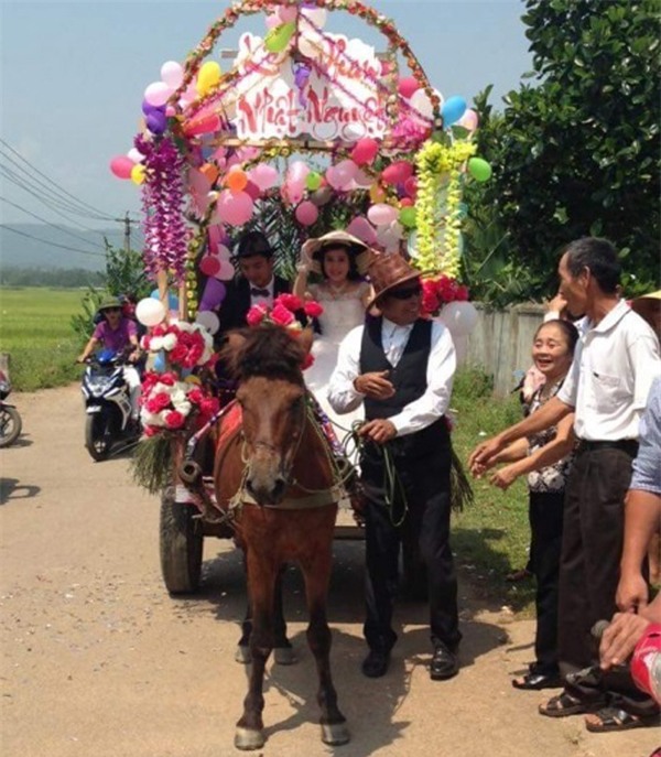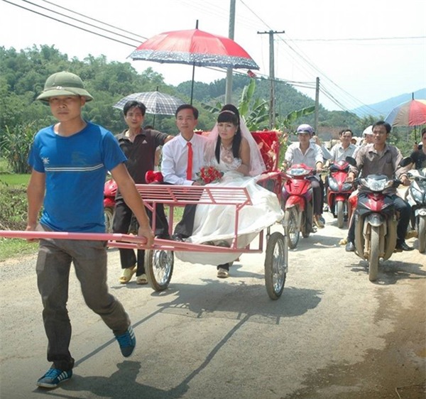 Hồi tháng 6, mạng xã hội cũng xôn xao về những hình ảnh ghi lại màn rước dâu ở một vùng quê thuộc huyện Lang Chánh (Thanh Hóa). Trong đó, cô dâu - chú rể ngồi trên chiếc xe tự chế do một người kéo.