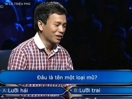 Theo đó, ngay từ câu hỏi đầu tiên của nhà báo Lại Văn Sâm 'Đâu là tên một loại mũ?' với 4 đáp án: lưỡi hái (A), lưỡi trai (B), lưỡi lê (C), lưỡi rắn (D), người chơi đã sử dụng ngay sự trợ giúp hỏi ý kiến khán giả trong trường quay.