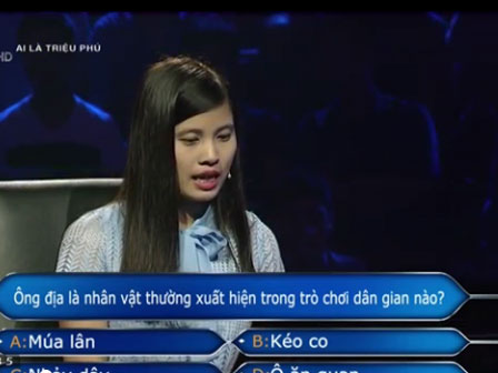 Trong chương trình phát sóng tối 1/11, người chơi Nguyễn Thị Hoa (25 tuổi, giáo viên ở Quảng Ninh) không biết đáp án cho câu hỏi: "Ông Địa thường xuất hiện trong trò chơi dân gian nào?". Chị dùng quyền trợ giúp hỏi ý kiến khán giả và vượt qua câu hỏi thứ năm.