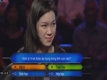 Câu hỏi như sau: "Định lý Vi-et được áp dụng trong lĩnh vực nào?" và 4 lựa chọn được đưa ra là: Vật lý, Toán học, Sinh học và Hóa học. Người chơi tỏ ra bối rối trước câu hỏi này và quyết định sử dụng sự trợ giúp của tổ tư vấn tại trường quay.