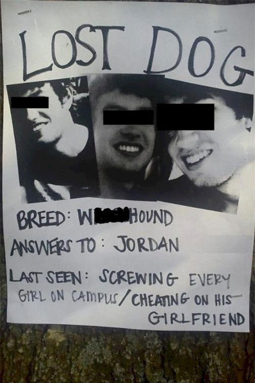 Bảng truy nã "Tìm chó lạc" có tên W...Hound vì lừa dối mọi cô gái trong trường/lừa dối bạn gái.