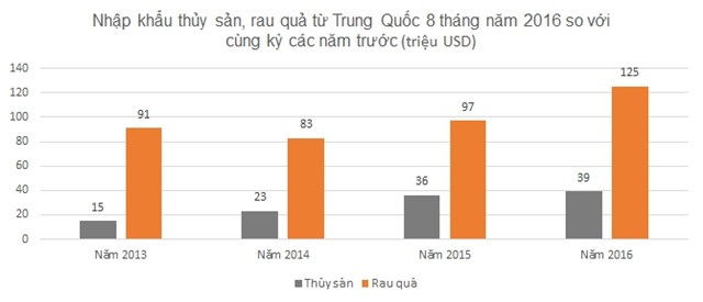 triệu USD nhập thủy sản và 125 triệu USD nhập rau quả từ Trung Quốc, các