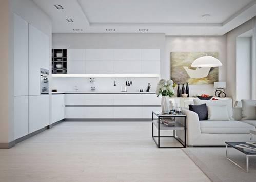 - Vì phòng khách và bếp liền nhau trong một căn nhà ống hay một căn hộ chung cư nên việc sử dụng cùng một phong cách cho hai phòng này là điều tất yếu. Điều này sẽ tạo ra sự đồng nhất tương đồng để mang tới sự sang trọng. Thông thường phong cách hiện đại được sử dụng cho những kiểu thiết kế này.