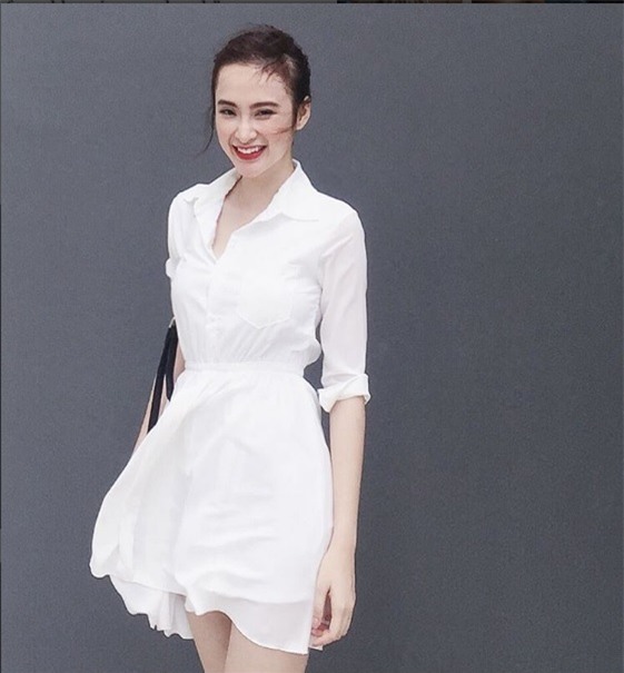 Angela Phương Trinh nhẹ nhàng và ngọt ngào trong một chiếc váy sơ mi phom classic. Chiếc váy này tạo cơn sốt trong thời gian vừa qua