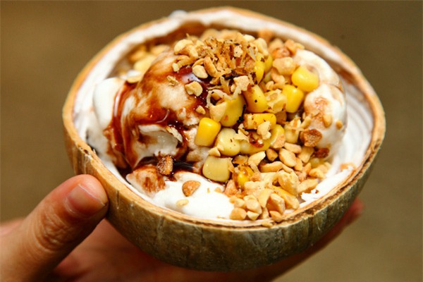 Nổi bật nhất trong số đó, chắc không thể không nhắc đến kem dừa - "siêu sao" trong lòng bạn trẻ. Chỉ với viên kem trắng ngần, đặc, ngậy vị béo được đặt gọn trong gáo dừa xiêm nhỏ, bên cạnh là cùi dừa được nạo nhỏ và rắc xung quanh, thêm chút lạc, dừa sấy hay vài viên thạch dừa, xôi... là bạn đã có thể chìm đắm trong hương vị ngọt ngào của kem dừa Thái rồi.