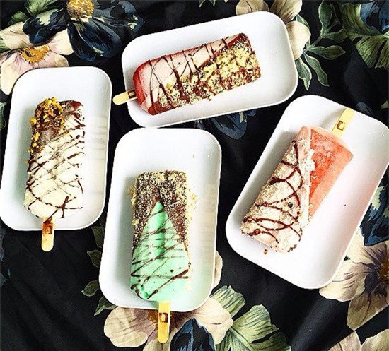 Này nhé, có chiếc kem được nhúng chocolate đen một nửa chéo que kem, chiếc khác lại được phẩy chocolate tạo hình lạ mắt...