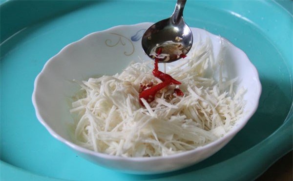 Măng sau khi lột vỏ, người ta xắt chúng thành từng sợi mỏng, nhỏ và dài bằng ngón tay, vì nếu xắt dày một tí thì gia vị sẽ không thấm, ăn sẽ cứng, không ngon. Măng xắt xong sẽ rửa qua một lượt nước rồi thả vào nồi nước đang sôi luộc chừng 5 phút. Khi măng vừa chín thì vớt ra rổ cho ráo nước.