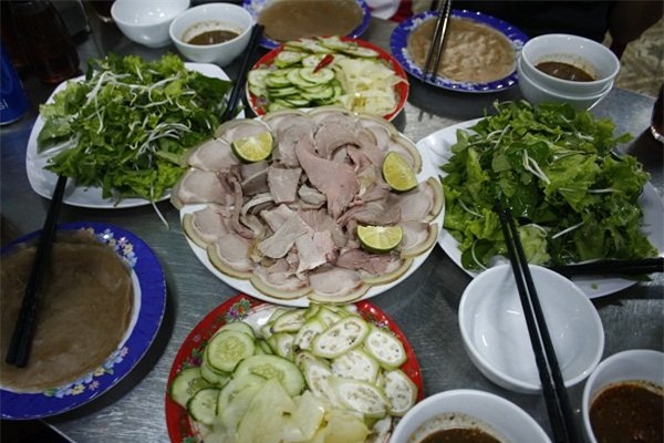Nếu như ở miền Bắc món bê thui chỉ được phục vụ cùng với vài lát khế và bát nước tương thì ở Cầu Mống bê thui lại trở nên đặc biệt hơn bởi những gia vị ăn kèm.