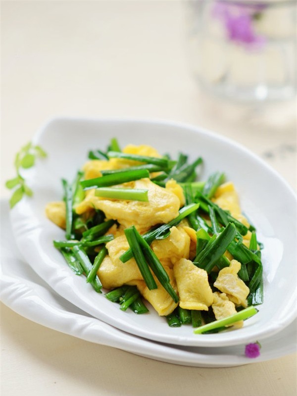Tắt bếp trút trứng ra để riêng. Sau đó tiếp tục cho dầu ăn vào chảo, cho nóng trở lại rồi trút lá hẹ vào xào nhanh tay với lửa to để lá có màu xanh đẹp mắt.