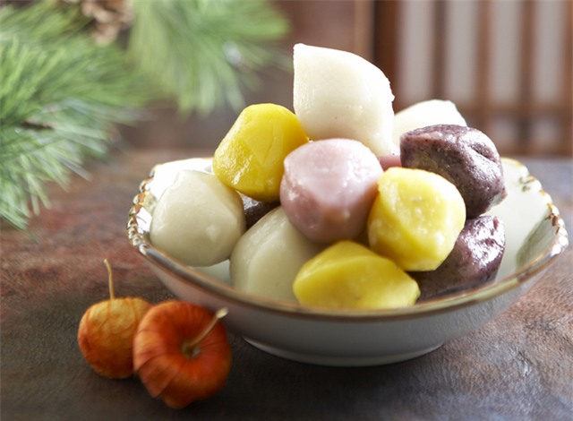 nhiều màu sắc. Nguyên liệu chính gồm bột gạo ngọt, bột nếp, đậu đỏ, vụn