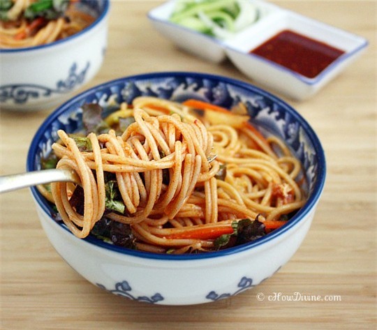 Mì lạnh cay có sợi mì nhỏ được làm từ hột sắn dây hay yến mạch, sau đó trộn với sốt ớt có độ cay mạnh. Ảnh: Chowdivine.com.