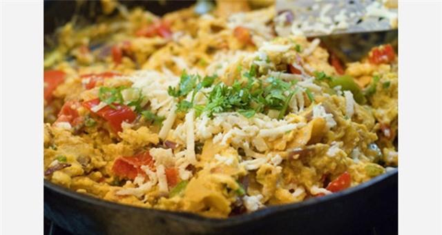 Trứng được trộn với ớt xanh, ớt đỏ, cà chua và húng tây rồi đảo đều