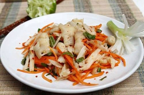Cách làm: Bào đu đủ thành từng sợi mỏng. Ngâm đu đủ vào thố nước lạnh, có để vài viên đá lạnh, giữ đu đủ được giòn lâu. Tai lợn rửa sạch với nước muối pha loãng, luộc tai lợn chín, khi luộc thêm vào một thìa nhỏ giấm. Không nên đun lâu, làm tai lợn mất giòn, không ngon.