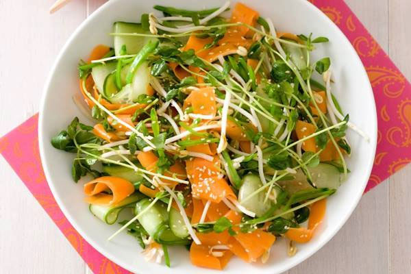Cách làm: Dưa leo, cà rốt rửa sạch, thái lát thật mỏng. Nếu không thích ăn cà rốt sống vì sợ cứng thì bạn có thể thái lát rồi chần sơ cà rốt bằng nước sôi để mềm hơn. Rau mầm, giá đỗ nhặt và rửa sạch, để ráo. Trộn các gia vị vào một bát nhỏ.