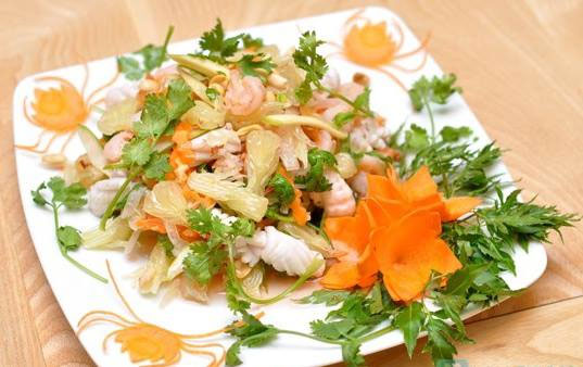 Cách làm: Bưởi tách vỏ lấy các múi bưởi rồi tách cho các múi bưởi rời ra. Tôm luộc chín, lột vỏ. Mực làm sạch , chần qua nước sôi có chút gừng để loại bỏ mùi tanh.