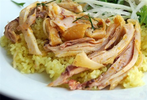 Cơm gà là sự kết hợp hài hòa giữa những miếng thịt gà luộc dai, ngọt và phần cơm được nấu bằng nước luộc gà. Ảnh: Hoàng Nhi.